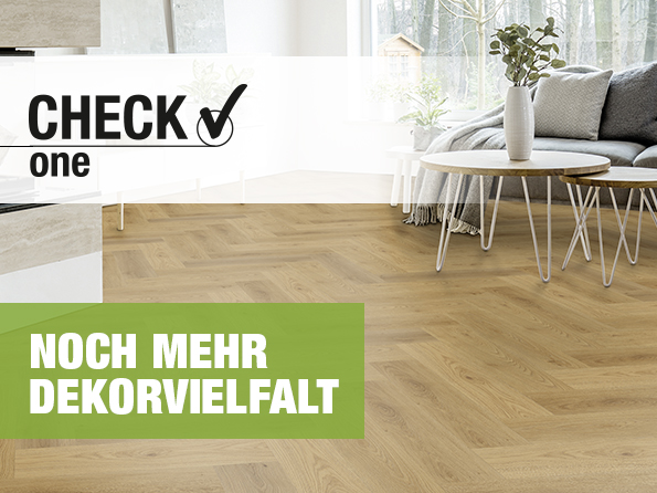 Die drei neuen Eichendekore der Premium Collection von CHECK one sind im Breitdielenformat mit 1220 x 229 x 5 mm und als Herringbone Diele in 592 x 148 x 5,5 mm erhältlich. Auch bei den neuen Dekoren wird der Qualitätsstandard von einer 42er Nutzungsklasse gehalten, sodass die Böden allen schweren Belastungen des Wohnbereichs, Gewerbes und der Industrie standhalten.
